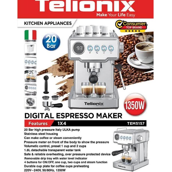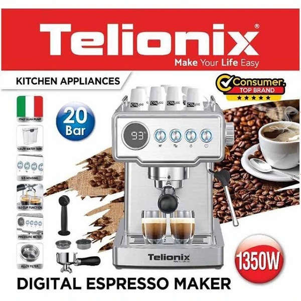 دستگاه اسپرسو ساز تلیونیکس(Telionix) با فشار ۲۰ بار ، عصاره گیری مطلوب انواع قهوه را دارد این دستگاه حرفه ای ۱۳۵۰واتی در مقایسه با سایر نمونه ها مشابه خود بهترین و مطلوب ترین نوع عصاره گیری را انجام میدهد .